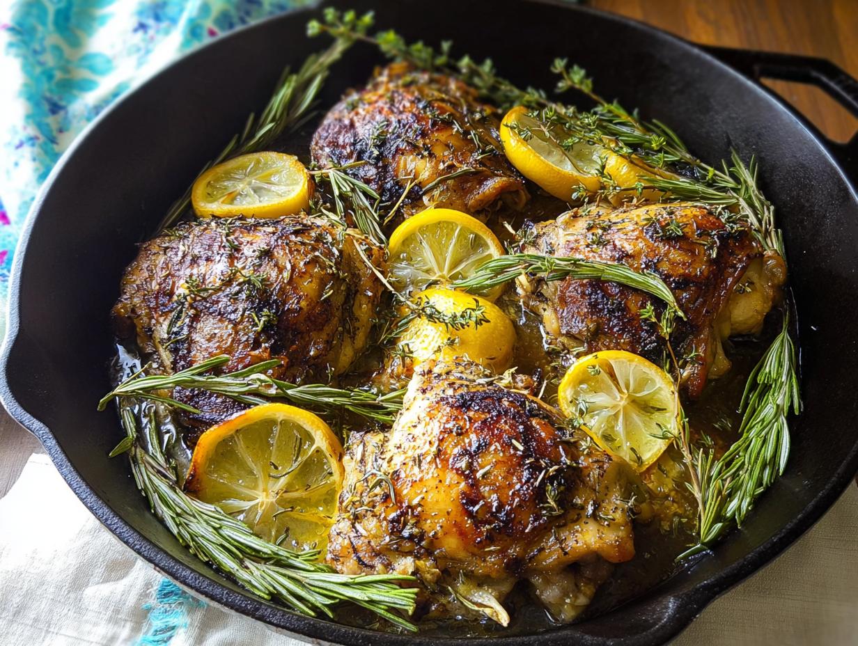 Once you’ve got that gorgeous crispy skin, gently flip those thighs over. Now, tuck those lovely sprigs of fresh thyme and your sliced lemon rounds all around the chicken in the skillet. They’ll roast and release their amazing aromas, infusing the chicken with incredible flavor. Carefully transfer the whole skillet into your preheated oven. Roast for about 15-18 minutes, or until the chicken is cooked all the way through. You’ll know it’s done when the juices run clear. And there you have it – simple perfection!