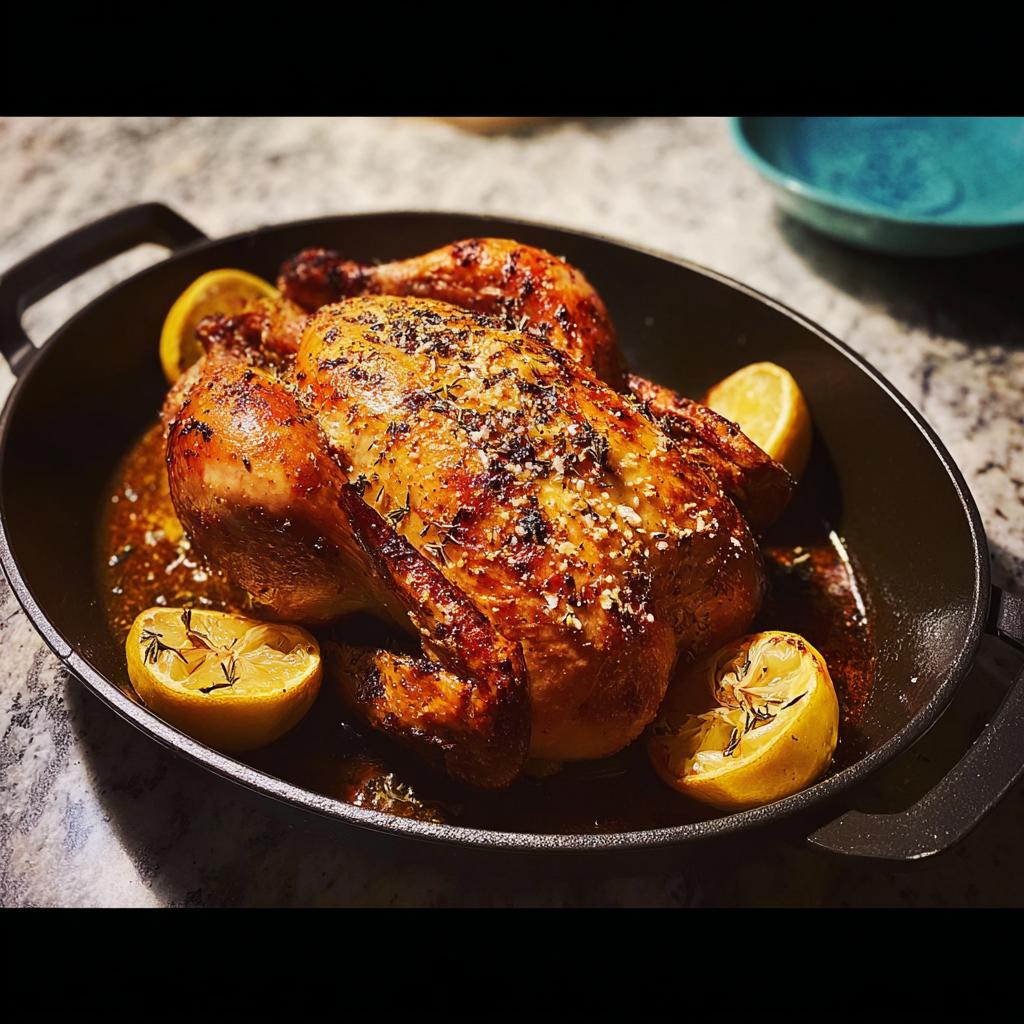 A perfectly roasted golden chicken with crispy skin, seasoned with herbs and spices, served with lemon slices in a black roasting pan. A simple yet elegant dish for 5-Ingredient Dinner Recipes.