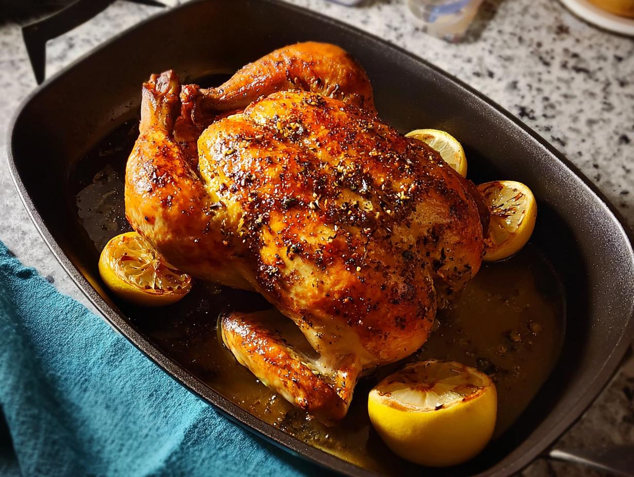A perfectly roasted golden chicken with crispy skin, seasoned with herbs and spices, served with lemon slices in a black roasting pan. A simple yet elegant dish for 5-Ingredient Dinner Recipes.